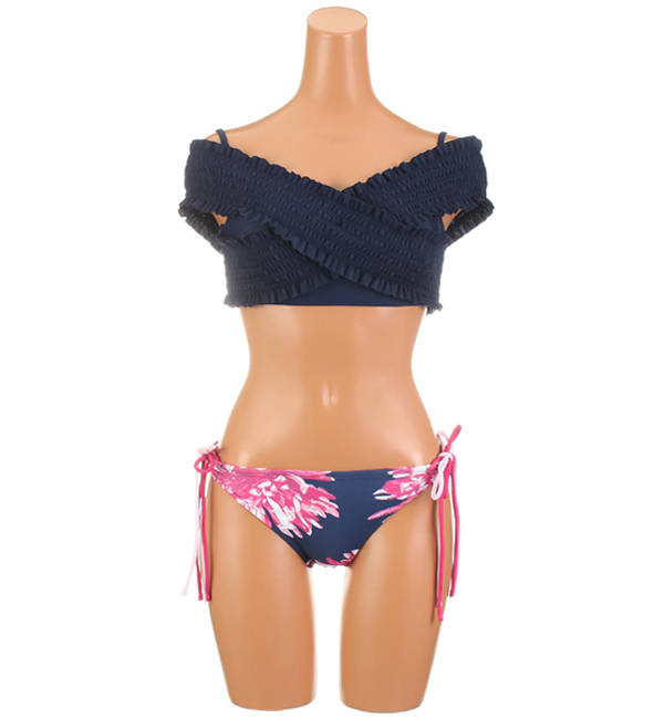 無地×フラワー柄シャーリングクロスビキニ