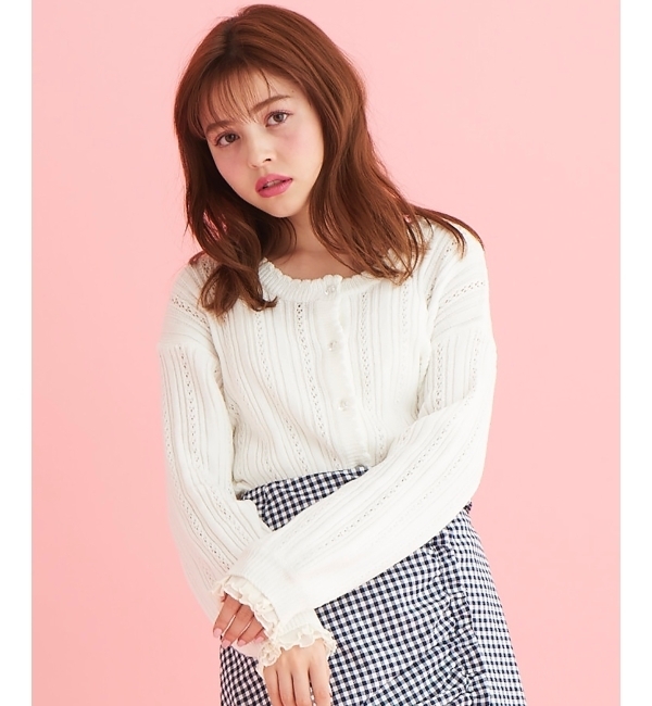 【送料無料】 爽やかな透かし柄が可憐な印象の、女の子らしい優しい雰囲気なショートカーディガンのお目見え♪柔らかいさっぱりとしたニット素材で仕立てられており、クリアなビジューボタンが華やかさを加えます!普段の着こなしにプラスワンで、ガーリーなアクセントを添えてくれる魅力溢れるアイテムです☆*摩擦や水濡れによる色落ち・色移りにご注意下さい。*素材の特性上、毛羽立ち・毛抜け・ピリング(毛玉)が生じますのでご注意下さい。 マジェスティックレゴン/MAJESTIC LEGON トップス|カーディガン