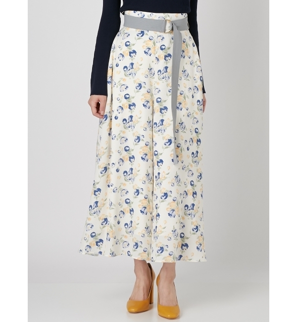 【送料無料】 つぼみのチューリップのブーケが春の訪れを感じさせるオリジナル柄を少し暖かみのあるピーチ起毛サテンにプリントしています。たっぷりと入れたフレアがスカート見えする女性らしいシルエットのパンツです。少し太めのウエストベルトに配色のサッシュベルトでアクセントを出しています。とろみのあるテロンチ合わせがおすすめです。 ※シルクスクリーンプリントが裏面にも色が載ります。 マーキュリーデュオ/MERCURYDUO パンツ|その他