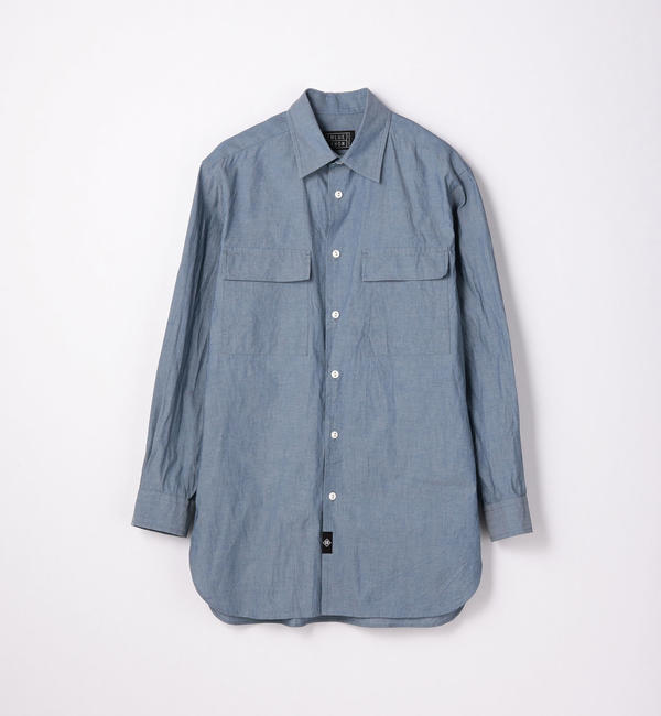 【送料無料】 大きめの胸ポケットが特徴のワークシャツ。通常のカジュアルシャツと比べて少し長めの着丈は、一枚で着用した時の存在感はもちろん、ジャケットやブルゾンとレイヤードし裾を覗かせるのもおすすめ。フレンチワークを意識した深めにラウンドした裾と包みボタンがデザインのポイント。着用を繰り返すことで風合いの変化が楽しめる一着です。MADE IN JAPAN2018SS商品店舗にお問い合わせの際は、下記の品番をお申し付けください。品番:54018101001 トゥモローランド/TOMORROWLAND BLUE WORK|トップス|シャツ・ブラウス