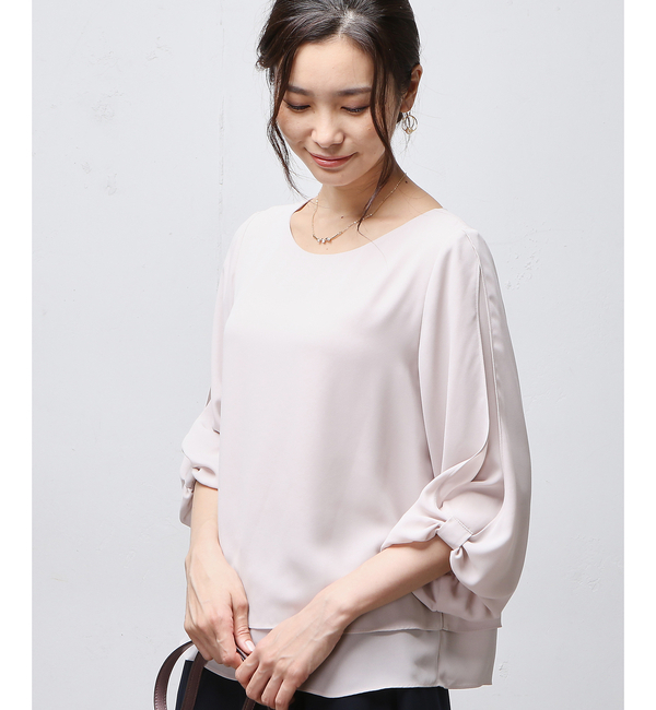 【送料無料】 パフスリーブにひとひねり加えたシンプルブラウス。エアリーな素材感とフェミニンな雰囲気で、旬なシルエットに仕上がっています。リボンのようなデザインを袖に施し、女性らしさを演出。クルーネックなので胸元の開きも気になりません。印象をピリリと引き締めるネイビーと、柔らかいイメージのベージュを取り揃えています。デニム合わせからキレイめスタイルまで幅広いスタイリングで合わせられる万能アイテムです!※撮影場所やお使いのモニター環境により若干お色味が異なる場合がございます。特にロケの撮影では明るく見える傾向にございます。トルソー撮影画像で色味をお確かめくださいます様お願いいたします。※予約商品はサンプルで撮影をしております。若干の仕様が変更になる場合がございますので予めご了承の上ご注文くださいますようお願いいたします。 コラージュ ガリャルダガランテ/COLLAGE GALLARDAGALANTE トップス|シャツ・ブラウス