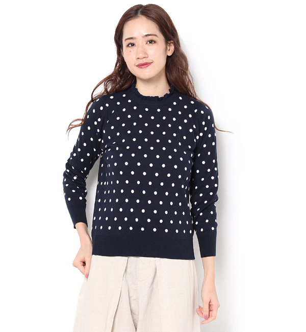 【送料無料】 <LA MARINE FRANCAISE>冬から春にかけてのスイッチアイテムとして重宝するのがコットンニット。中肉厚の生地感で仕上げているので、少し肌寒さが残る時期でもあたたかく着ていただけます。ドット織りでインパクトを持たせつつ、モノトーンカラーでまとめることで大人可愛い雰囲気で着こなしが可能。首元には別生地でフリル衿を付け、レイヤード風なデザインでアクセントを付けました。シルエットや着丈をコンパクトに仕上げているので、ワイドパンツやフレアスカートなど、ボリューム感のあるボトムと好相性!アウターにもひびきにくく、春先に活躍する一枚です。 ニーム/NIMES MARINE FRANCAISE|トップス|ニット・セーター,プルオーバー