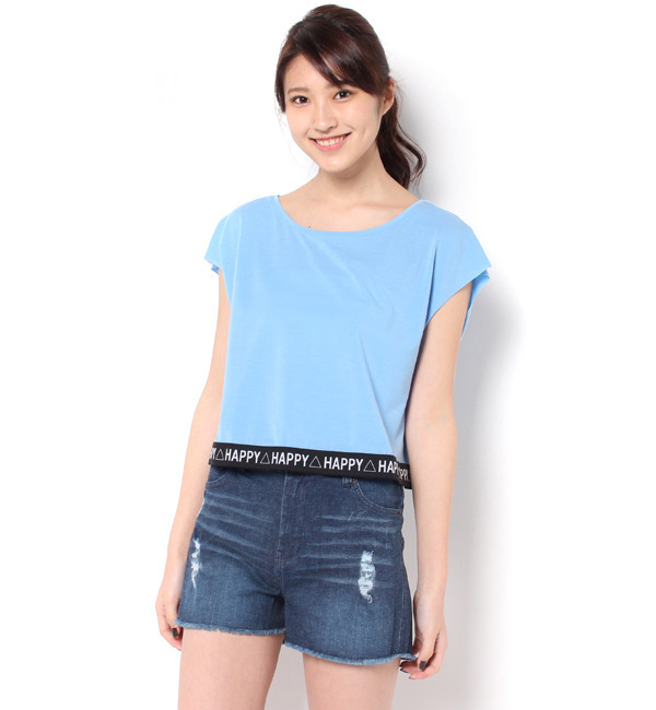 【送料無料】 裾のHAPPYロゴのジャガードゴムの切り替えでカジュアルさをキープしながら、ペールカラーの無地フレンチスリーブの身頃でキュートに仕上げたトップスです。ミックステイストとショート丈の生み出す軽快な着映え力が魅力になっています。キャミやチーフトップなどをインに、ショートボトムスで楽しみたくなる1枚です。 サンアイミズギラクエン/三愛水着楽園 トップス|Tシャツ・カットソー