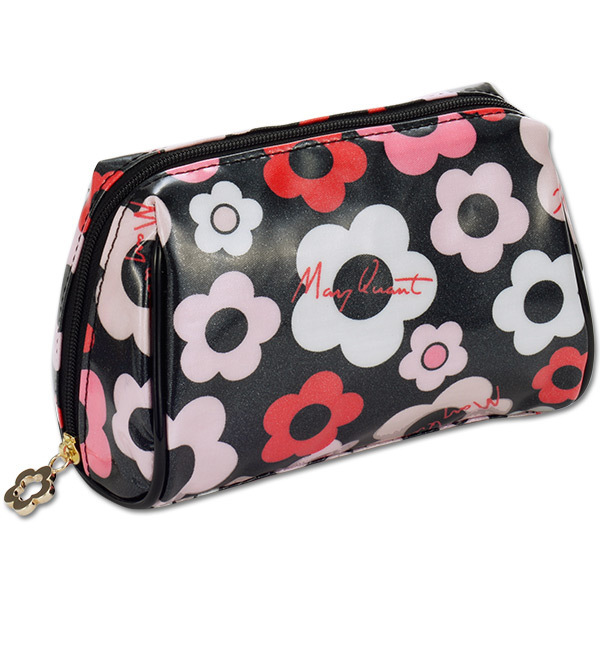 【送料無料】 大きめのデイジーをランダムに散りばめて、ラメ&光沢感あるプリントで華やかに仕上げたシリーズ。濃淡のピンクが際立つブラック、爽やかな印象のホワイトの2色展開で、サインロゴをアクセントに効かせました。デイジー型の引き手もポイントです。コロンとした形のポーチは、収納しやすく機能性も抜群。内側にポケットが4つとギャザーポケット1つ、ゴムホルダーが2つ付いています。 マリークヮント/MARY QUANT MARY QUANT|小物|ポーチ