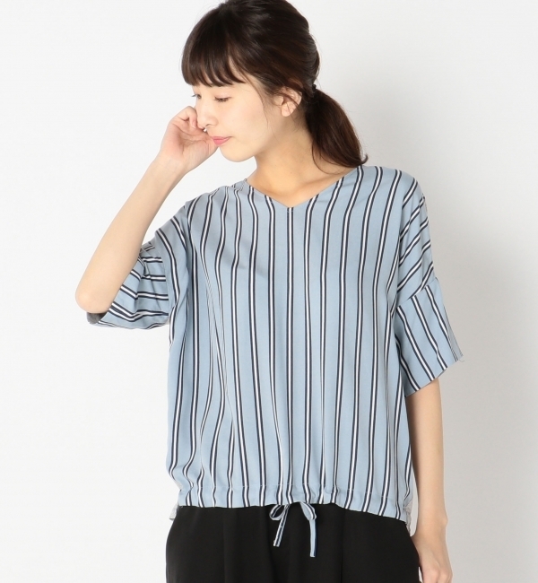 【送料無料】 春先に大好評頂いき、即完売になったストライプブラウスが再登場です!前身頃は布帛素材、後ろはカットソー生地で切替になっており、ブラウスとTシャツの正に良いとこどりなアイテム。ブラウスのキレイな雰囲気を持ちつつ、後ろ身頃はストレッチの入ったTシャツ生地で着心地◎やや長めな袖丈も二の腕をカバーしてくれて嬉しいです。裾部分に紐を通しているので変化も付けられ、絞りの具合で合わせるボトムとのバランスも調整出来ます。 アルカリ/alcali nota della mano sinistra|トップス|シャツ・ブラウス
