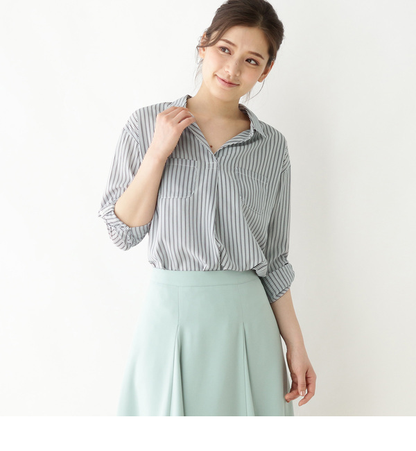 【送料無料】 透け感のあるストライプシャツ。衿元にボタンがないからインナーを見せてバリエーションを増やせばそれだけで印象ががらりと変わります!春先に活躍しそうです。※オフホワイト(203)、ベージュ(252)は透け感があるため、インナーの着用をおすすめします。モデル情報:身長168cm B80 W56 H84 着用サイズ:09(M)店舗へのお問い合わせ商品番号:732-84213主に春に着用いただける商品です。 中国製 スープ/SOUP SOUP|トップス|シャツ・ブラウス