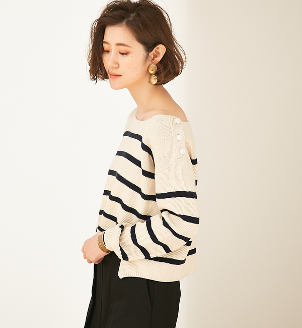【送料無料】 定番のボーダーニットも程よくルーズなシルエットと広めに取ったネックラインで女性らしい抜け感が演出できるアイテムに。きれいめのボトムスともマッチしますが、デニム合わせでリラックス感のあるオフスタイルもおすすめ。ショルダーのボタン使いも注目のデザインポイントです。※スリット7CMです。model:H165・B80・W60・H86 着用サイズ:FREE アバハウス・ドゥヴィネット/Abahouse Devinette Abahouse Devinette|トップス|ニット・セーター