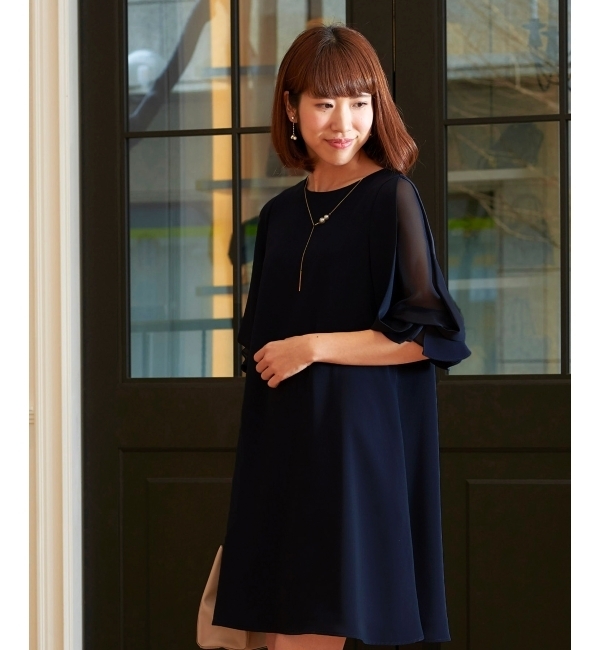 【送料無料】 シフォン生地をあしらった透け感のあるスリーブがアクセントになった、大人の上品な要素をプラスしてくれるドレス♪程よいハリととろみのあるゴージャスな生地感に仕上げられ、袖口フリルでより女性らしい雰囲気に◎幾何学モチーフをほどこしたネックレスは、スライドタイプで取り付けやすい優れものです。*モデル撮影は光の当たり具合で色味が違って見える場合があります。詳しくはハンガー画像をご確認ください。*デリケートな素材を使用しておりますのでお取扱いにご注意下さい。*摩擦や水濡れによる色移りにご注意下さい。*この製品は部分的にハンドメイドです。 ペルルペッシュ/Perle Peche ワンピース|ドレス