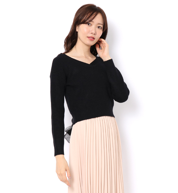 フェミニンムードがたっぷりなニットトップスが登場。背中にオンしたレース素材のリボンは、乙女心を刺激するガーリーなデザインです。バックリボンの上など、背中見せのアクセントもポイントになって抜け感をプラス。デコルテラインを美しく魅せる広めのVネックは女度を上げて、着こなしをアップデートさせてくれます! セシルマクビー/CECIL McBEE トップス|ニット・セーター