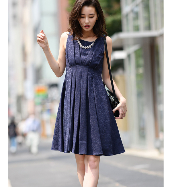 立体感のあるジャガード生地で仕立てたワンピース。 取り外し可能な付属のネックレスパーツで、胸元を華やかに演出してくれます。 ウエスト部分に取ったタックと、裾に向かってきれいに広がるシルエットが女性らしい印象に。 品のあるデザインは特別な席にピッタリなアイテムです。 アンディコール/un dix cors ワンピース|ドレス