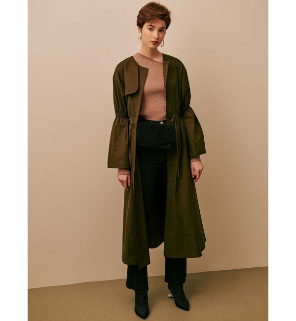 リタリーとトレンチコートエッセンスを融合したロングコート。ウエストにギャザーを寄せて着用してもヒモを絞らずルーズにも着用いただけます。※外人モデル着用はボタンが実際の商品と仕様が異なります ラグナムーン/LAGUNAMOON アウター|ノーカラーコート