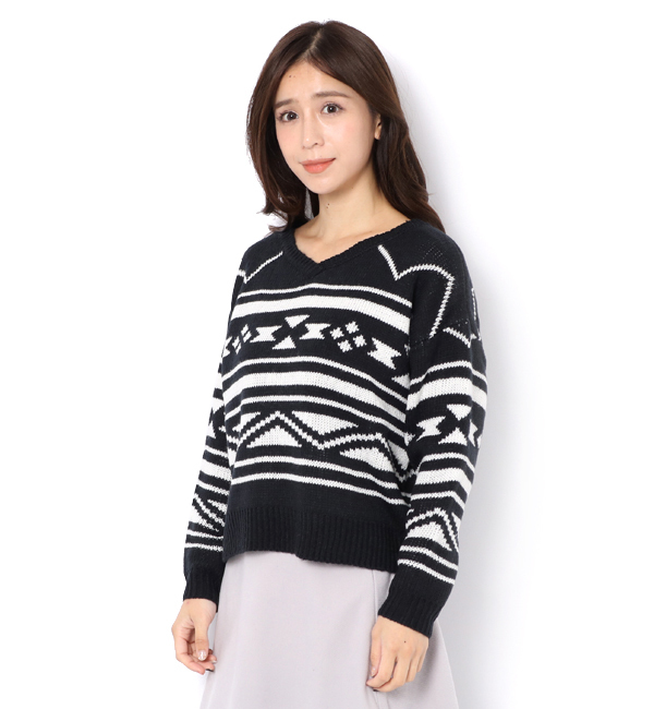 ネイティブアメリカンの伝統的な柄であるオルテガ柄が全体に描かれ、立体的な表情を生み出すジャカード織りで表現したVネックのプルオーバーです。 ビッグシルエットなのでざっくりと着用でき、顔の輪郭線がシャープに見えるVネックがポイントです。 テーパードパンツやガーリーなスカートと合わせたスタイルがおすすめです。 テチチ/Te chichi Te chichi TERRASSE|トップス|プルオーバー