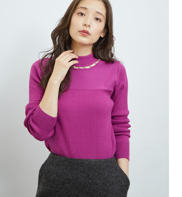 フロントネックに素肌の覗く、モックネックの長袖ニットプルオーバーです。ネックの僅かな隙間には、パールビーズをあしらって華やかさをプラスしています。また胸元から編地を切り替えることで、ウエストに向けてスッキリ見えるように工夫したのもポイント。アクリルベースの軽やかな素材を使用しました。洗濯又はクリーニングの際は、裏返してネットを使用して下さい。洗濯の際、多少色落ちしますので、単品でお洗い下さい。洗濯後は脱水してすぐに干して下さい。濡れたまま放置しますと色泣きや他の衣類などに色移りすることがあります。この製品は水洗いで多少縮みます。水洗い後の乾燥機のご使用は避け、自然乾燥して下さい。スチームアイロンは使用しないで下さい。装飾部分へのアイロンはお避け下さい。この製品は、摩擦(特に湿った状態での摩擦)や、汗や雨などで濡れた際に、他の衣料や下着(特に白物)に色移りする場合がありますので、十分ご注意下さい。この製品は、強い日光(または照明)を長時間受けると変色する場合があります。着用及び保管の際は、ご注意下さい。また、汗に濡れたまま長時間日光を浴びたり、濡れたまま放置すると変色する恐れがあります。日光の下に放置せずに、速やかに洗濯およびクリーニング処理をするようにお願いします。この製品は着用中の摩擦や洗濯、クリーニングにより毛羽立ち・ピリング(毛玉)が生じることがあります。着用後はブラシで毛並を整え、出来てしまった毛玉は糸を傷つけないように小バサミや毛玉取り器などで除去して下さい。装飾部分が引っかかりやすくなっておりますので、バッグやアクセサ リーで引っ掛けないようにご注意下さい。●ピリングとは繊維の表面が着用中にこすられたり、もまれたりするため、毛羽の小さなもつれが絡み合い、次第に大きくなって出来た毛玉のことです。これは、素材の特性上着用の際避けられない現象で、その発生を完全に防止することは出来ません。●ピリングにはお手入れが肝心です。気にいっているからといって、毎日同じ商品をお手入れなしで着続けますと、必ずピリングは出来やすくなります。1日着用したら2日休ませるなどローテーションを考えて着用して下さい。ピリングが出来ましたら引っぱって取ろうとせず、ブラッシングするか、小さなハサミで1つ1つ取り除いて下さい。気に入っていればいるほどお取扱いにもそれなりの気づかいが肝心です。 ∞
